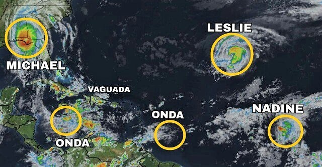 Likewise, the Category 1 Hurricane Leslie that travels 120 kilometers per hour in the eastern direction, and the tropical storm Nadine with winds of 100 kilometers per hour will degenerate a low pressure for this weekend.