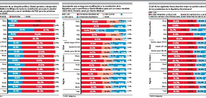According to the poll, the ruling PLD party sympathizers are divided with 55% approving constitutional reform and 42% against. The vote reflects the differences between incumbent President Medina and former President Leonel Fernández who aspires to be on the PLD ticket for the 2020 presidential election.