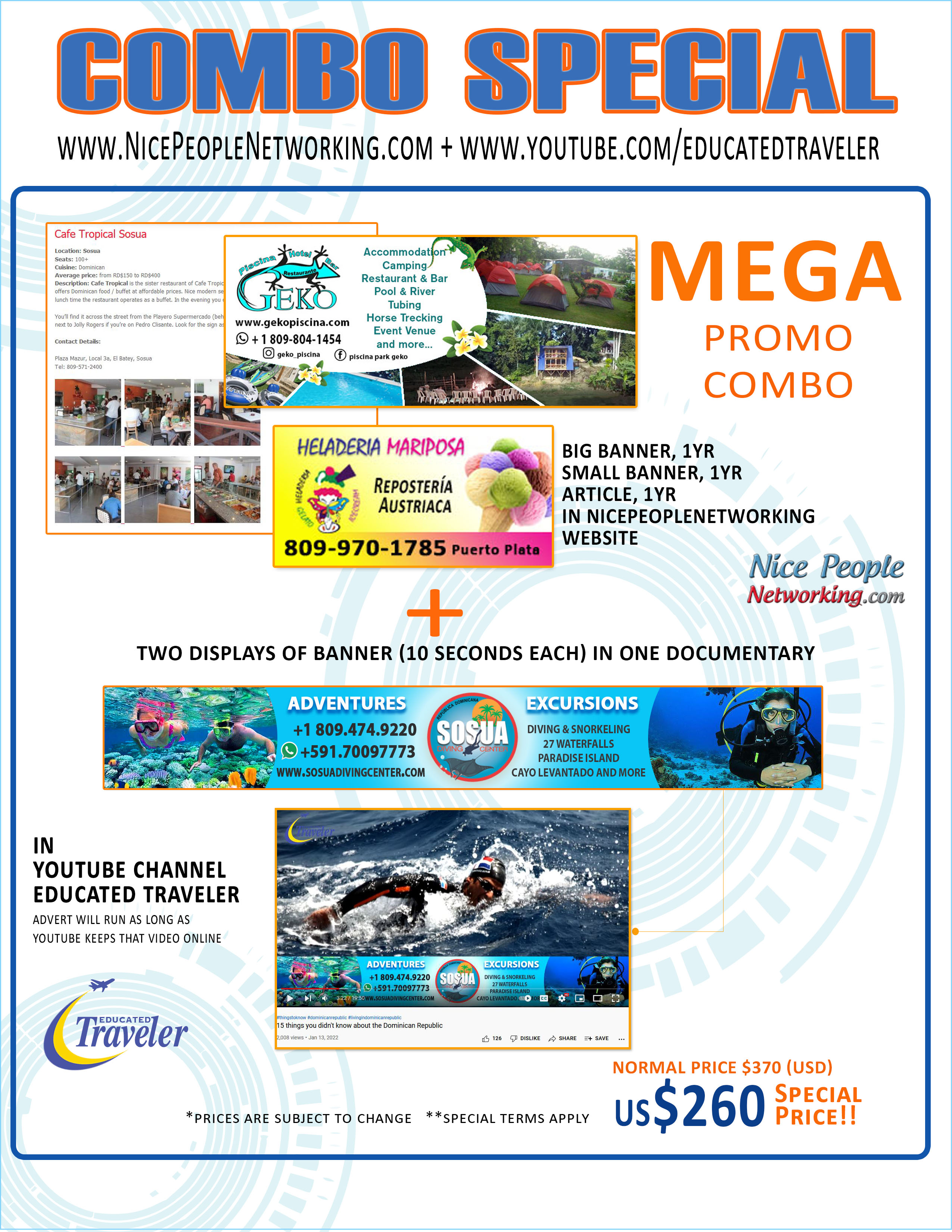 We’ll make you a 2-4 minute video presentation for our series “Business of the Week”, placed on the YouTube channel – “NicePeopleNetworking”, and Instagram account (@educatedtraveler)